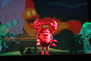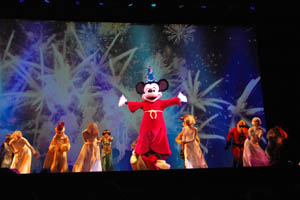 “Disney’s Flight of Fantasy” is a stage show with a backdrop of favorite scenes from a wide variety of Disney/Pixar films. It is a visual treat! The performances include music, dancing, and a stage full of Disney characters.